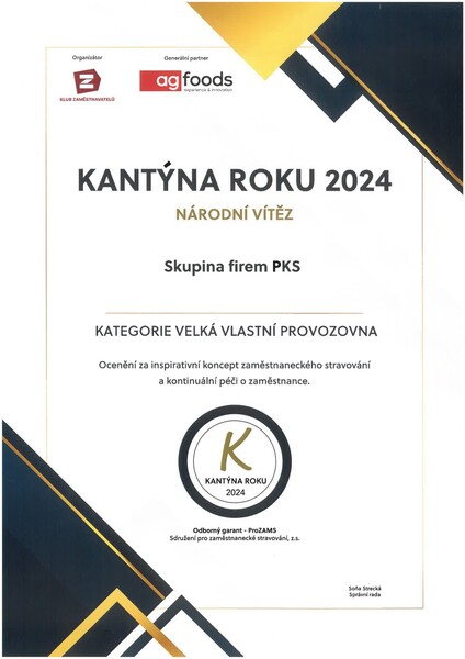 Máme velikou radost, protože jsme se stali národním vítězem zaměstnavatelského stravování.Titul Kantýna roku 2024 v pondělí 18. listopadu převzala v Praze naše vedoucí stravování Eva Zichová a náš personální a správní ředitel Petr Podaný.