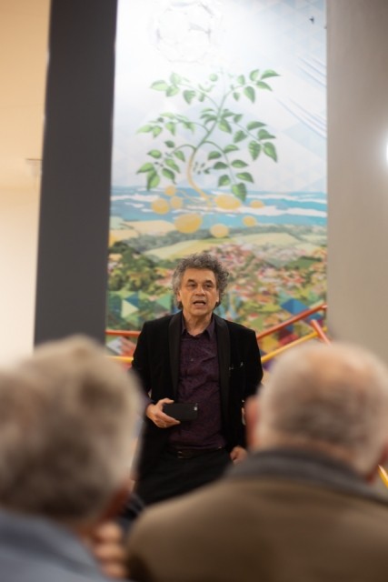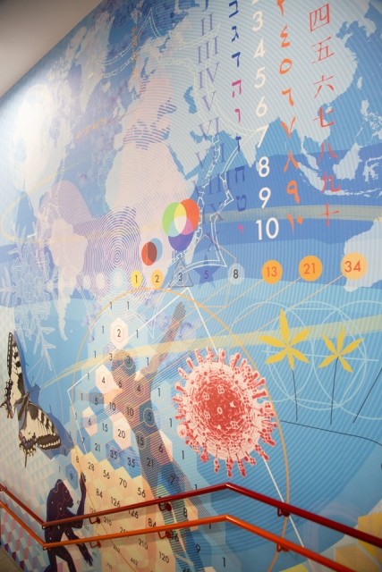 Součástí školy je také interaktivní instalace s lokálními motivy vytvořená přímo pro školu česko-mexickým umělcem Richardem Cortésem. Jedná se velkoplošný obraz, tzv. mural, který začíná v Okrouhlici, jak ji maloval rodák Jan Zrzavý, a končí mapou světa. Obsahuje spoustu známých i méně známých prvků a odkazů na různé fenomény matematické, geometrické, fyzikální, chemické i historické, které mohou v dětech vyvolávat otázky. Celý obraz se odvíjí od polí a pozemků v Okrouhlici jako k něčemu, k čemu máme vztah. Celá cesta z přízemí až nahoru do druhého patra následuje myšlenku J. A. Komenského „od konkrétního k abstraktnímu", tedy od známého k neznámému. Druhé patro je perspektivou cesty do světa. Motýl se vylíhne z larvy a vyletí do světa, aby se nakonec zase vrátil domů, do Okrouhlice. V té době už má však jiný přehled, novou perspektivu světa.